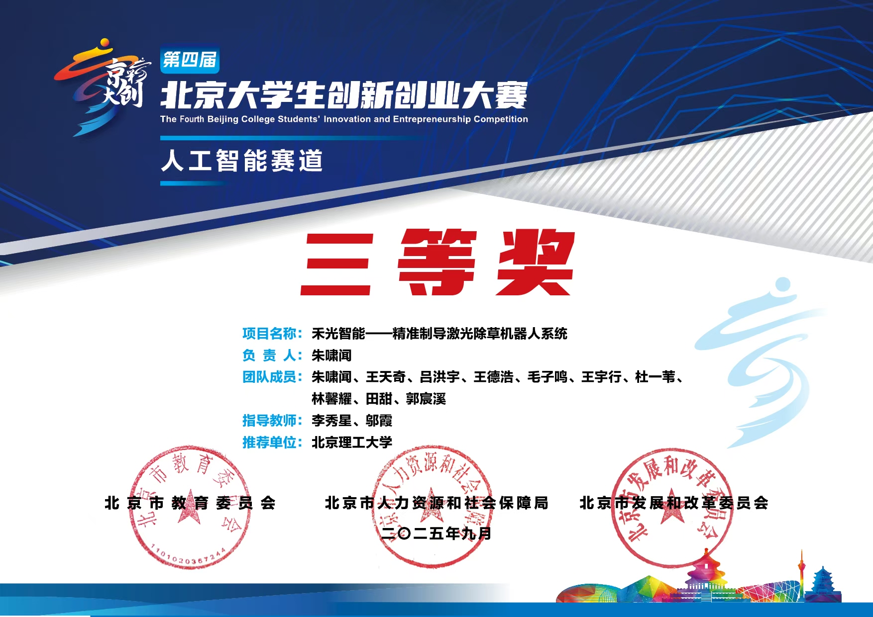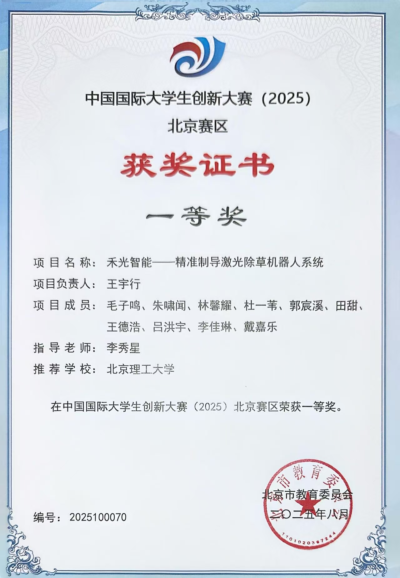 近日,从 “青创北京” 2025 年 “挑战杯” 首都大学生课外学术科技作品竞赛、中国国际大学生创新大赛及第四届北京大学生创新创业大赛传来捷报:脑智中心由李秀星、邬霞两位导师联合指导的 “禾光智能 —— 精准制导激光除草机器人系统” 项目组,凭借技术突破与应用价值,一举摘得 “挑战杯” 一等奖、中国国际大学生创新大赛特等奖、北京大学生创新创业大赛三等奖,成为跨赛事获奖的亮眼标杆。